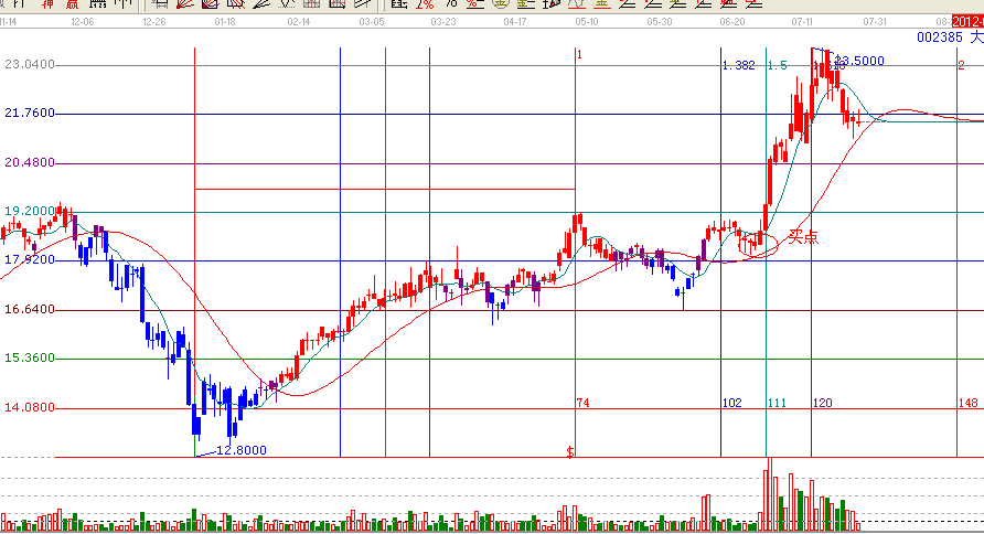 第二:依據贏家江恩分析系統(tǒng)時間工具黃金時間周期線分析:此票在6月29日提示1.5的變盤窗口,(黃金時間周期的取點,起點2012年1月6日,終點2012年5月7日的連線)