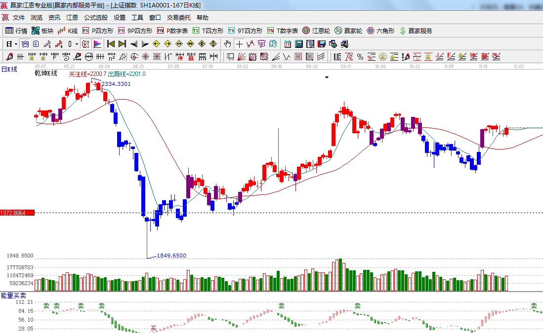 ★依據(jù)贏家江恩系統(tǒng)乾坤K線提示: 收盤價在藍(lán)色短期出局線上,繼續(xù)看多;